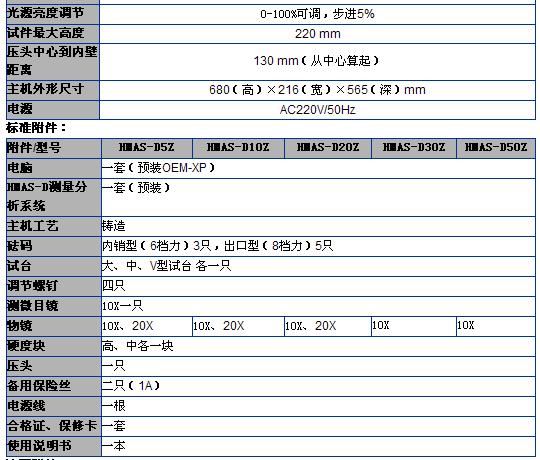 HMAS-D5Z/10Z/20Z/30Z/50Z維氏硬度測(cè)量分析系統(tǒng)是本公司推出的第六代光機(jī)電一體化的高新技術(shù)產(chǎn)品,該機(jī)器造型新穎,具有良好的可靠性,可操作性和直觀性,是采用精密機(jī)械技術(shù)、光電技術(shù)、圖形圖像處理技術(shù)和材料硬度分析軟件的新型維氏和努普硬度測(cè)試儀器。 性能特點(diǎn) 1、外觀新穎,采用微機(jī)控制自動(dòng)轉(zhuǎn)塔通過(guò)軟件執(zhí)行操作,進(jìn)一步實(shí)現(xiàn)測(cè)量的智能化。 2、設(shè)備擯棄傳統(tǒng)繁瑣測(cè)量步驟,測(cè)量方法更簡(jiǎn)便 3、設(shè)備自帶打印功能,可將相關(guān)測(cè)量參數(shù)打印并保存 4、設(shè)備能對(duì)被測(cè)材料進(jìn)行拍攝并能對(duì)其組織進(jìn)行分析和讀取 5、可調(diào)節(jié)測(cè)量光源強(qiáng)弱,可預(yù)置試驗(yàn)力保持時(shí)間、并能切換維氏和努氏試驗(yàn)方法 適用范圍: 熱處理、碳化、淬火硬化層,表面覆層,鋼,有色金屬和微小及薄形零件等.配備努氏壓頭后能測(cè)定玻璃、陶瓷、瑪瑙、人造寶石等較脆而又硬材料的努氏硬度. 技術(shù)參數(shù):